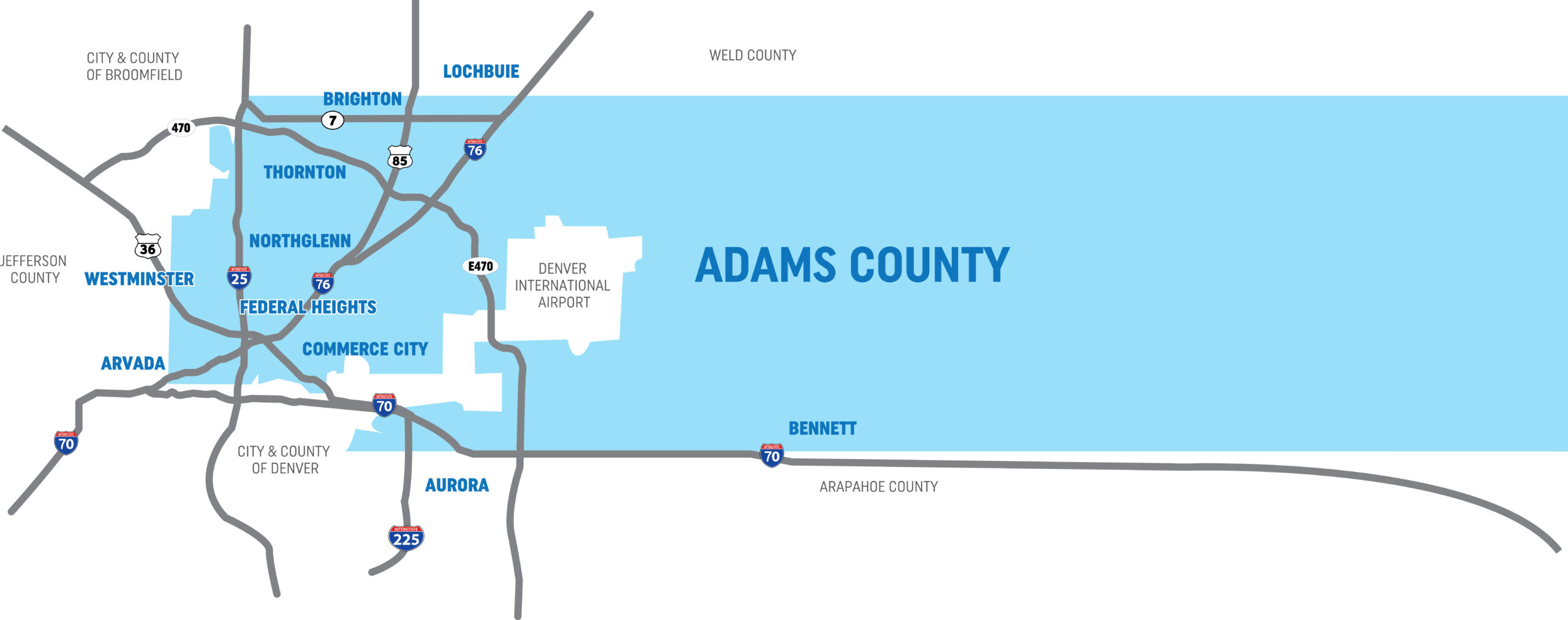 Adams County serves as a nexus in the region’s transportation network, with I-25, I-70, I-76, I-270, and E-470, along with other state highways and regional arterials, all intersecting in the county. Our central location provides businesses with exceptional access to regional and national markets, making Adams County an ideal destination for trade, transportation, and employment. The county encompasses multiple municipalities, each offering unique advantages and opportunities for business growth.